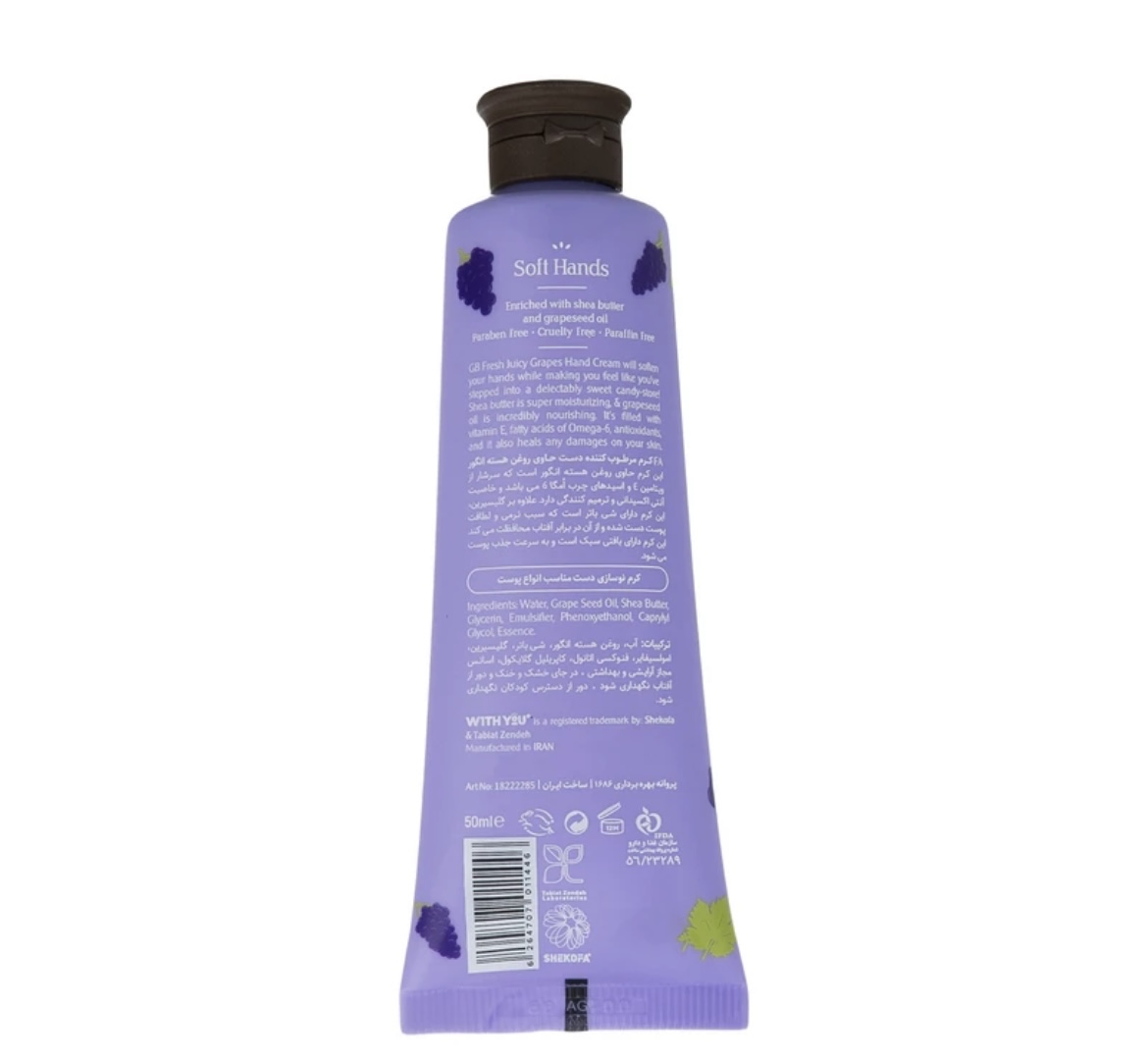 کرم نوسازی و مرطوب کننده دست ویت یو حاوی روغن هسته انگور، سرشار از ویتامین E و اسید های چرب امگا 6 می باشد و خاصیت آنتی اکسیدانی و ترمیم کنندگی خوبی دارد. علاوه بر گلیسیرین، کرم ویت یو دارای شی باتر است که سبب نرمی و لطافت پوست دست شده و از آن در برابر آفتاب محافظت می کند. این کرم دارای بافتی سبک است و به سرعت جذب پوست می شود.
