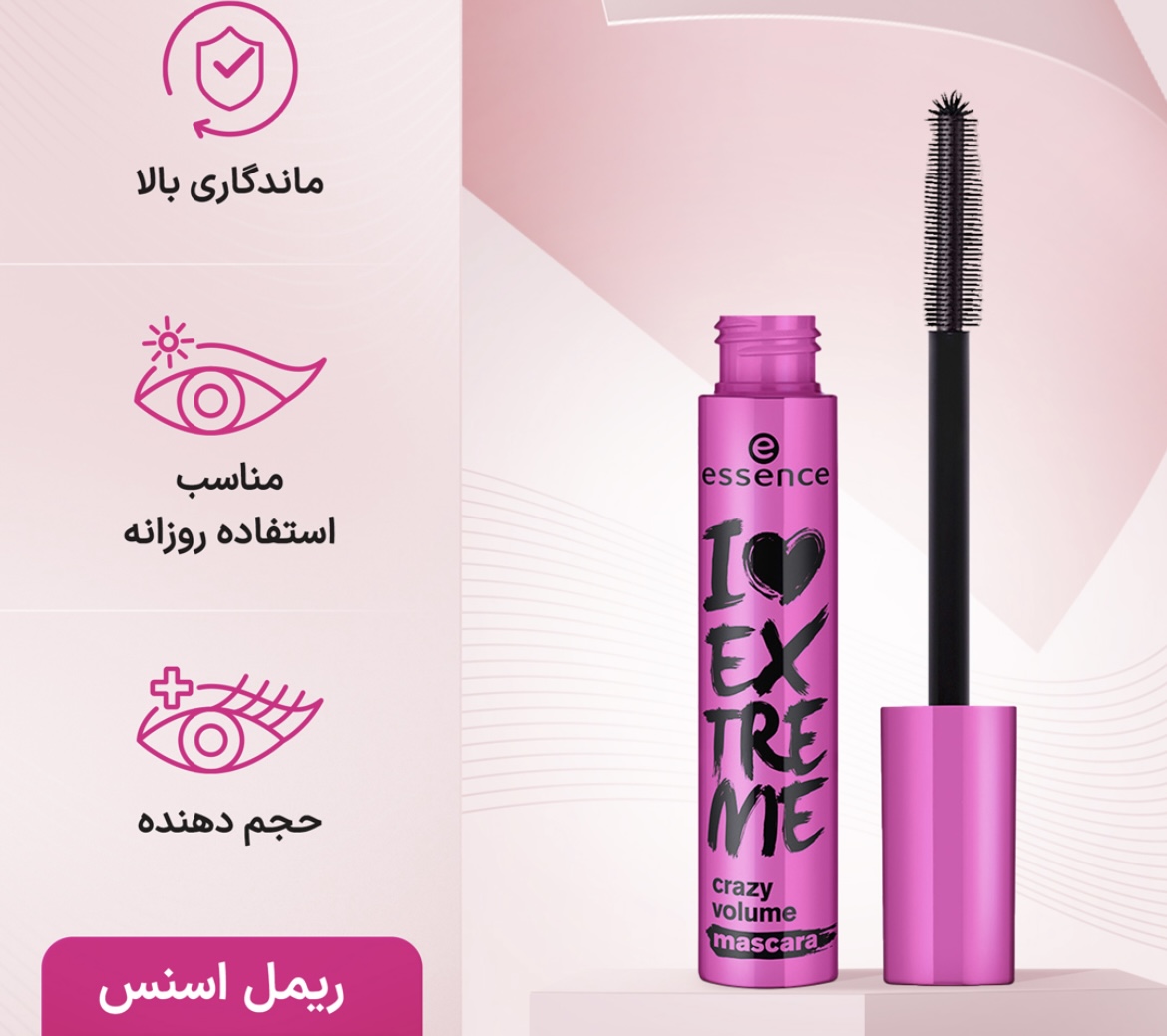 ریمل اسنس صورتی دارای برس ویژه و انعطاف پذیر است که موجب حالت دهی و تفکیک شدن مژهها میگردد. این ریمل دارای فرمولاسیون سبک است و از سنگین شدن مژهها جلوگیری میکند . ریمل ای لاو اکستریم ولوم بدون ایجاد حساسیت و ریزش، مژههایی بلند و خوش حالت به ارمغان میآورد.این محصول مژه ها را بلند و حجیم کرده و از چسبیدن مژه ها به یکدیگر جلوگیری می کند. این محصول از فرمولاسیون سبکی برخوردار بوده و احساس سنگینی بر روی مژه ها را نمی دهد.